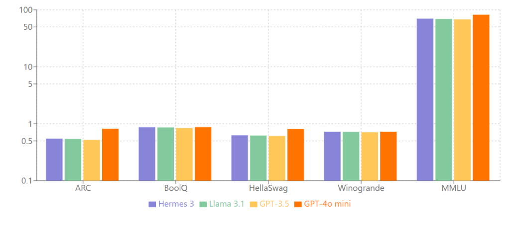 Il grafico mostra chiaramente che Hermes 3 si avvicina molto alle prestazioni di GPT-3.5 nei benchmark chiave come ARC, BoolQ e HellaSwag. Sebbene GPT-4o mini superi Hermes 3 in tutti i test, Hermes o anche Llama 3.1 quasi identico, dimostrano di essere un’alternativa valida e performante, particolarmente in contesti educativi o situazioni dove il software open-source è preferito. Questo sfata il mito comune che i modelli open-source non siano validi o utili quanto le soluzioni commerciali costose. Hermes 3 può quindi essere considerato un valido sostituto, soprattutto nelle scuole.