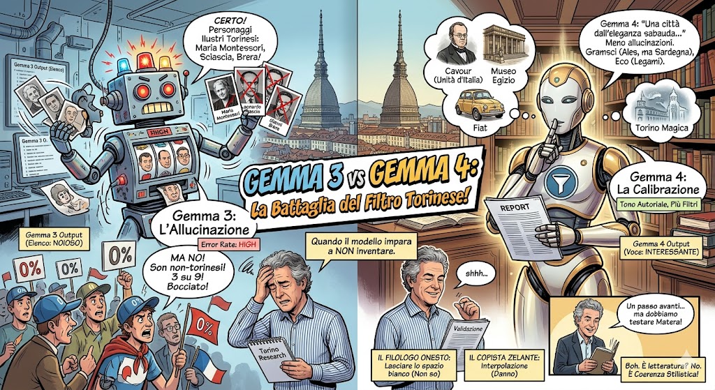 Il dettaglio più interessante è forse laterale. Gemma 4 include la “Torino Magica” — la credenza popolare sulla città divisa tra forze del bianco e del nero. È un elemento che non trovi sui manuali scolastici, ma che qualsiasi torinese conosce e che alimenta un discreto giro turistico. Gemma 3 la ignora completamente. Il che suggerisce che il modello più recente non ha solo più filtri — ha anche più fiuto per quello che rende un luogo interessante oltre la lista dei monumenti.
