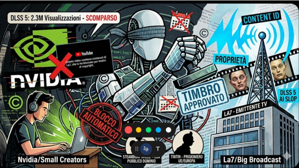 Il 5 aprile 2026, il video ufficiale di Nvidia che presentava DLSS 5 — 2,3 milioni di visualizzazioni, pubblicato tre settimane prima — è scomparso da YouTube. Il messaggio: “Questo video contiene contenuti di La7, che lo ha bloccato per motivi di copyright”. Nvidia si è vista sequestrare il proprio materiale da un’emittente televisiva italiana che lo aveva semplicemente mandato in onda in un notiziario.